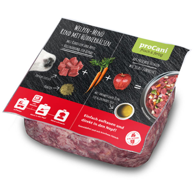 Das ideale Hundefutter um groß und stark zu werden: Unser Welpen-Komplettmenü vom Rind. Das BARF Frostfutter liefert Welpen und jungen Hunden proteinreiches und zugleich saftiges Rindfleisch mit fein gemahlenen Hühnerhälsen. Für ausreichend Obst und Gemüse sorgen beigemischte Äpfel und Karotten. Ein Klecks Kräuter und hochwertiges Futteröl runden unser Welpenmenü ab.